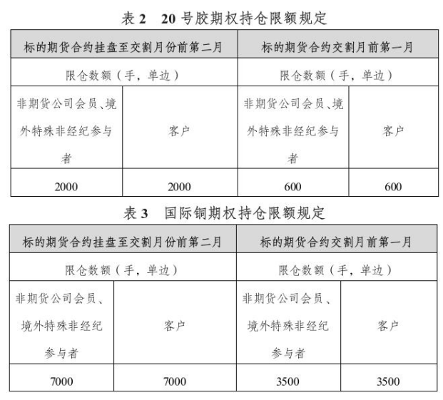 20号胶期权合约月份涉及的标的期货持仓量阈值为10000手(单边);国际铜期权合约月份涉及的标的期货持仓量阈值为5000手(单边)。